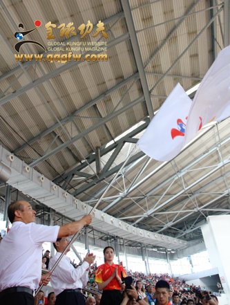 開幕式上,中國武協(xié)主席、國家體育總局武術運動管理中心主任高小軍先生向大會組委會主席傅彪先生授會旗。大會組委會主席傅彪向著名表演藝術家六小齡童頒授武交會形象大使證書。北京市體育局副局長苑振洲先生致歡迎詞,他代表組委會向運動員、教練員、裁判員、全體來賓和新聞媒體表示熱烈歡迎,向支持武術發(fā)展的社會各界人士表示真摯的感謝。他說,“2014北京國際武術文化交流大會是在前三屆武交會的基礎上舉辦的,本屆大會從賽事組織上更加規(guī)范,賽事規(guī)模上更加宏大,為來自世界各國與地區(qū)的武術愛好者們提供展示精彩武藝的平臺。”國際功夫聯(lián)合會副主席兼歐洲功夫聯(lián)合會主席尼克來先生代表國際友人致辭,他代表歐洲功夫聯(lián)合會以及全體參賽的國外代表隊對本次大會表示熱烈祝賀,希望通過這次大會,增進對中國武術的了解,促進各國武術界與中國武術界的交流。