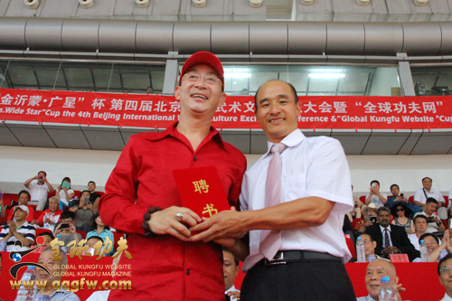 聯(lián)合國友好使者、中國武協(xié)副主席、國際功夫聯(lián)合會主席、北京國際武術文化交流大會組委會主席傅彪先生向六小齡童頒發(fā)武交會形象大使證書。